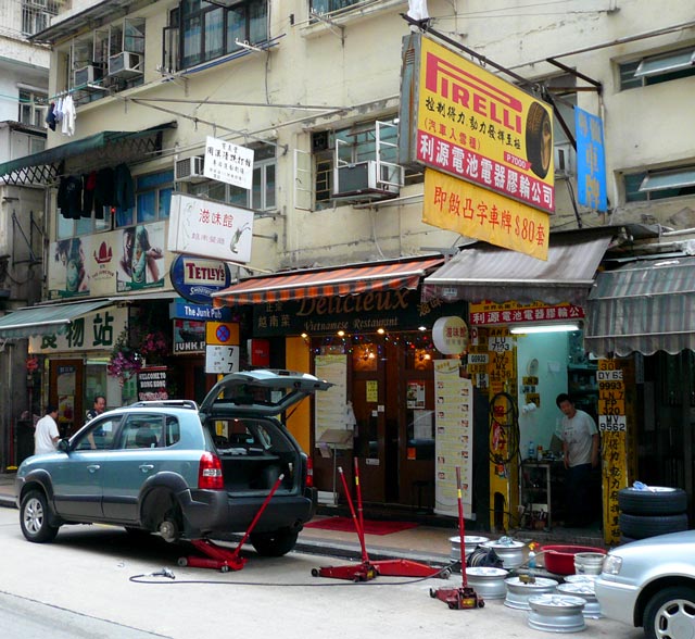 Cosa Kirjoitettu 9. Elokuuta, 2008 Kirjoitettu 9. Elokuuta, 2008 Paikallinen rengasliike honkkarissa. Tommonen pieni luukku ilman mitään hallia. Ei varmaan Suomessa onnistuisi asennella naapuriravintolan edessä renkaita
