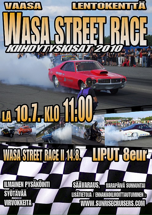 406cid Kirjoitettu 11. Kesäkuuta, 2010 Kirjoitettu 11. Kesäkuuta, 2010 Neljän vuoden tauon jälkeen Wasa Street Race on palannut ! Tällä kertaa 1/8 mile kiihdytyskisana Kisapäivät : LA 10.7. ja LA 14.8.2010 Valitettavasti Seinäjoelle tarkoitettu kiihdytyskisa meni puihin 2010 vuoden osalta, mutta 2011 järjestelyt ovat menossa.